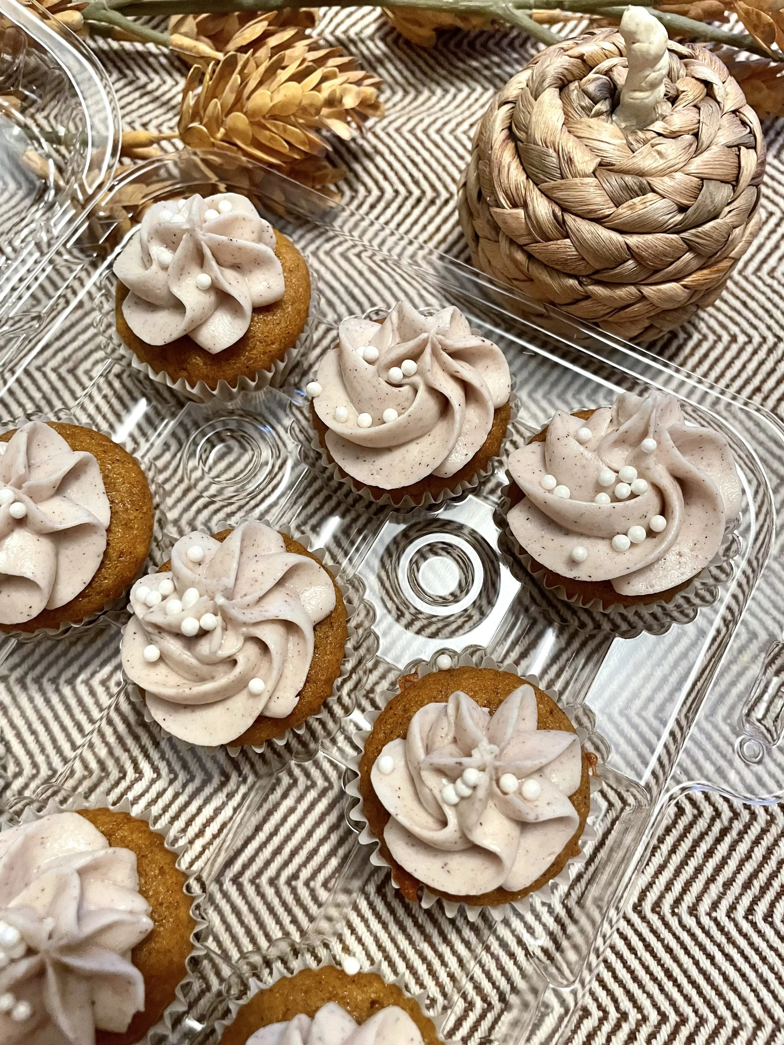Shop › Pumpkin Spice Cupcake (12) Pumpkin Spice Cupcake (12) from $20.00 Pumpkin cupcake with cinnamon buttercream and pearl sprinkles. Pumpkin cupcake with cinnamon buttercream and pearl sprinkles. Size: Select Size Full Size Mini Quantity: Add To Cart Added!